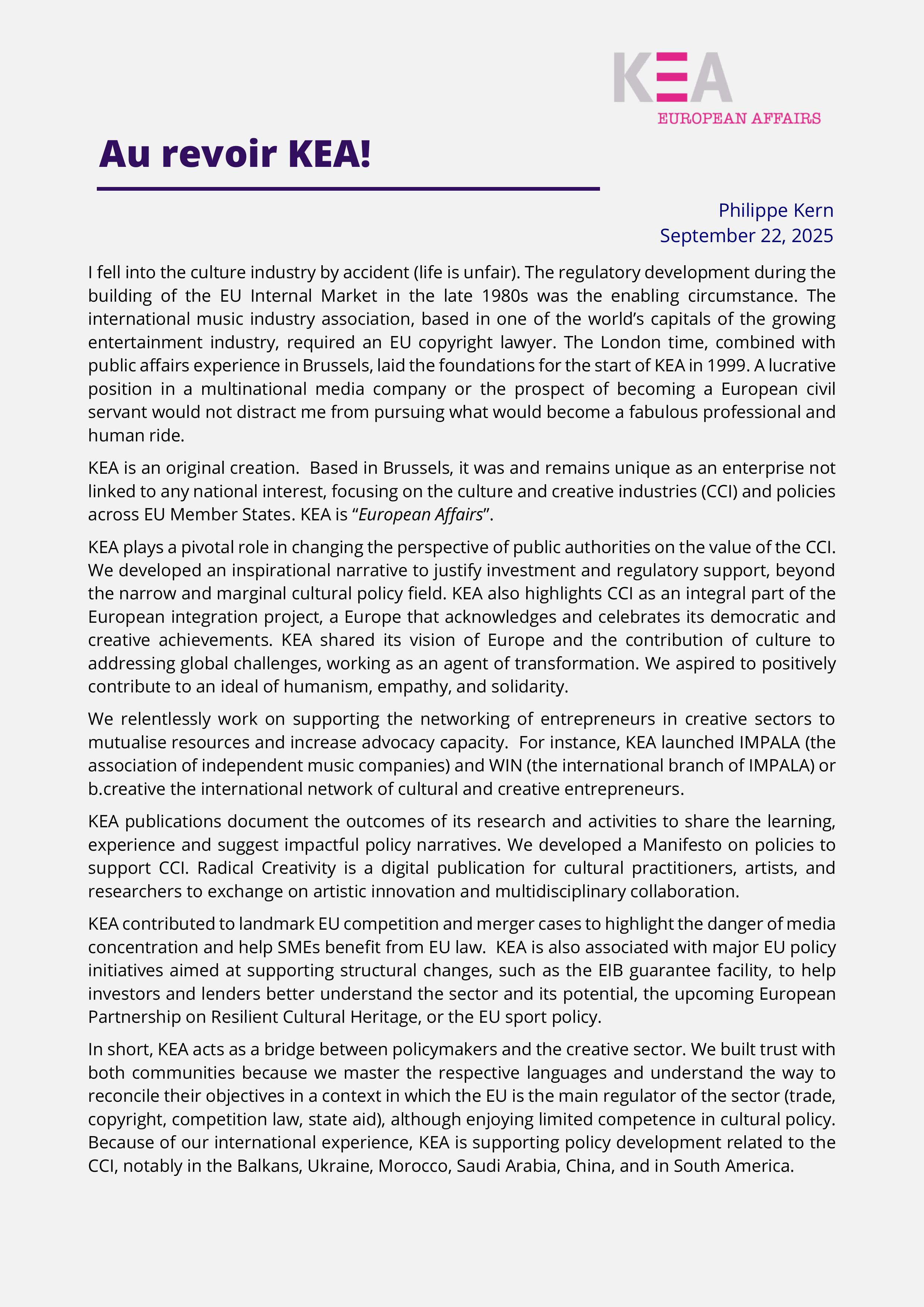 After a remarkable journey as the Managing Director of KEA, its founder Philippe Kern is stepping down to retire. Philippe’s visionary leadership has been instrumental in positioning KEA as a unique and influential voice in European cultural affairs by bridging policy and creativity, advocating for humanist values, and championing the transformative power of culture.